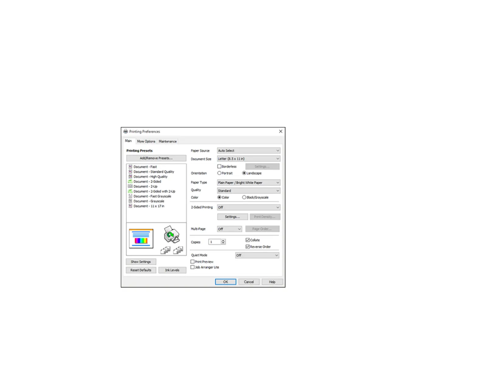 You see the Main tab of your printer settings window: