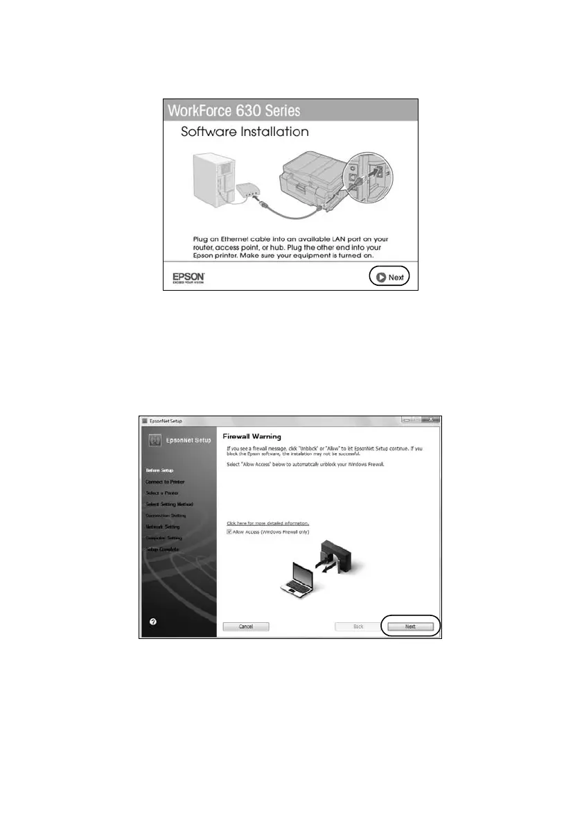 If you see a firewall alert message, click Unblock or Allow to let EpsonNet Setup