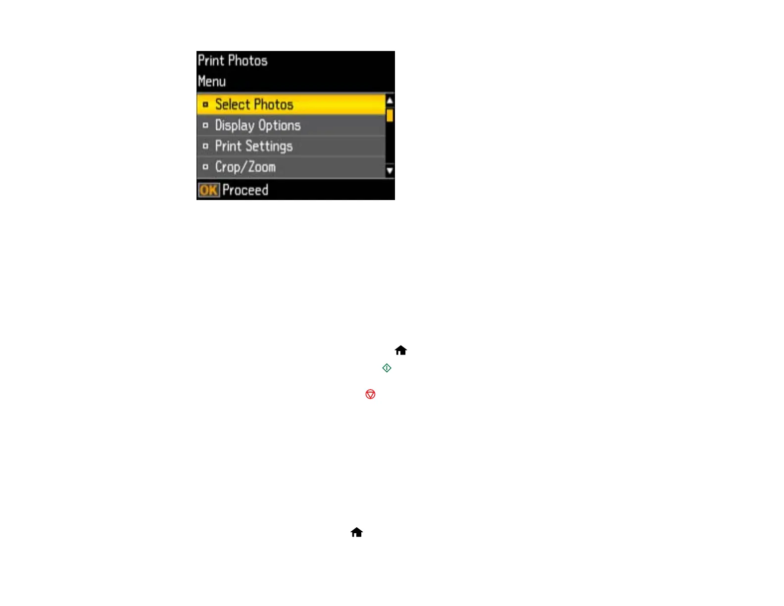 • To change the selected photos and number of copies to print, select Select Photos, press the OK