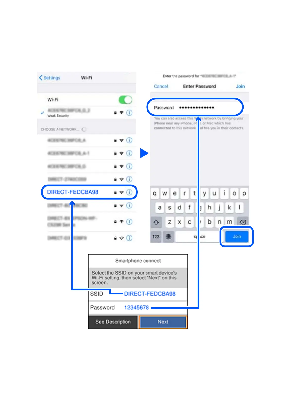4. On the smart device's Wi-Fi screen, select the SSID shown on the printer's control panel, and then enter the