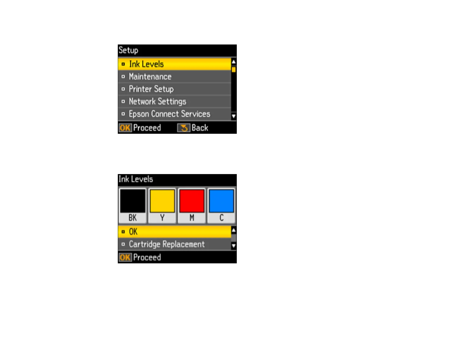 Note: The display is different depending on which ink cartridges are low or expended, if any.