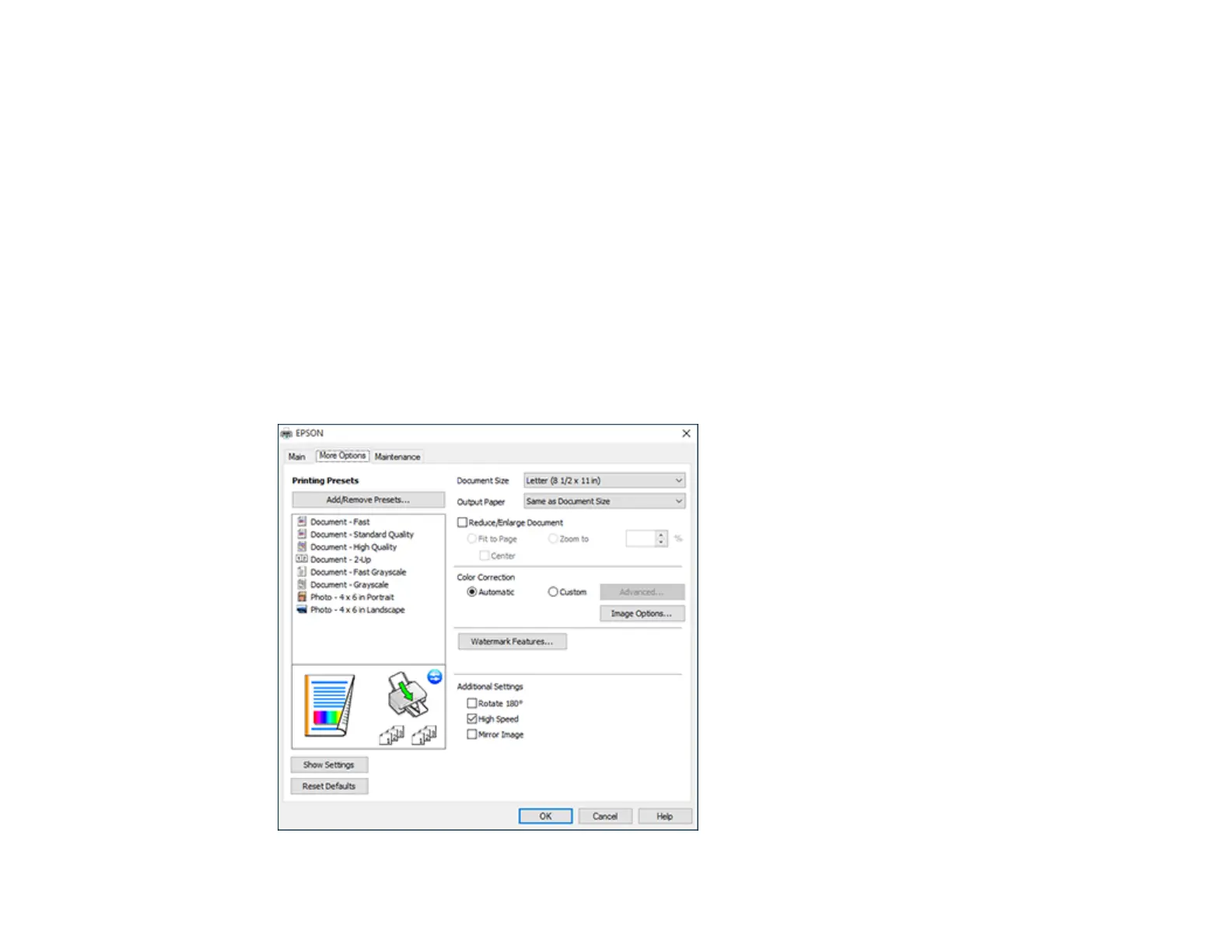 You can select a variety of additional layout and printing options for your document or photo on the More