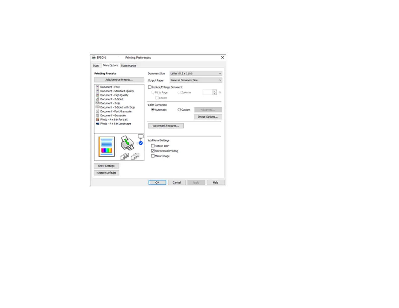 You can select a variety of additional layout and printing options for your document or photo on the More