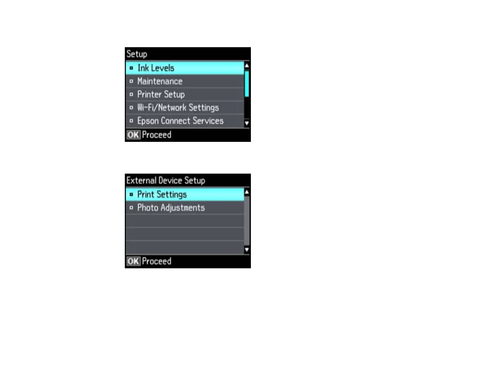 2. Press the left or right arrow button, select Setup, and then press the OK button.