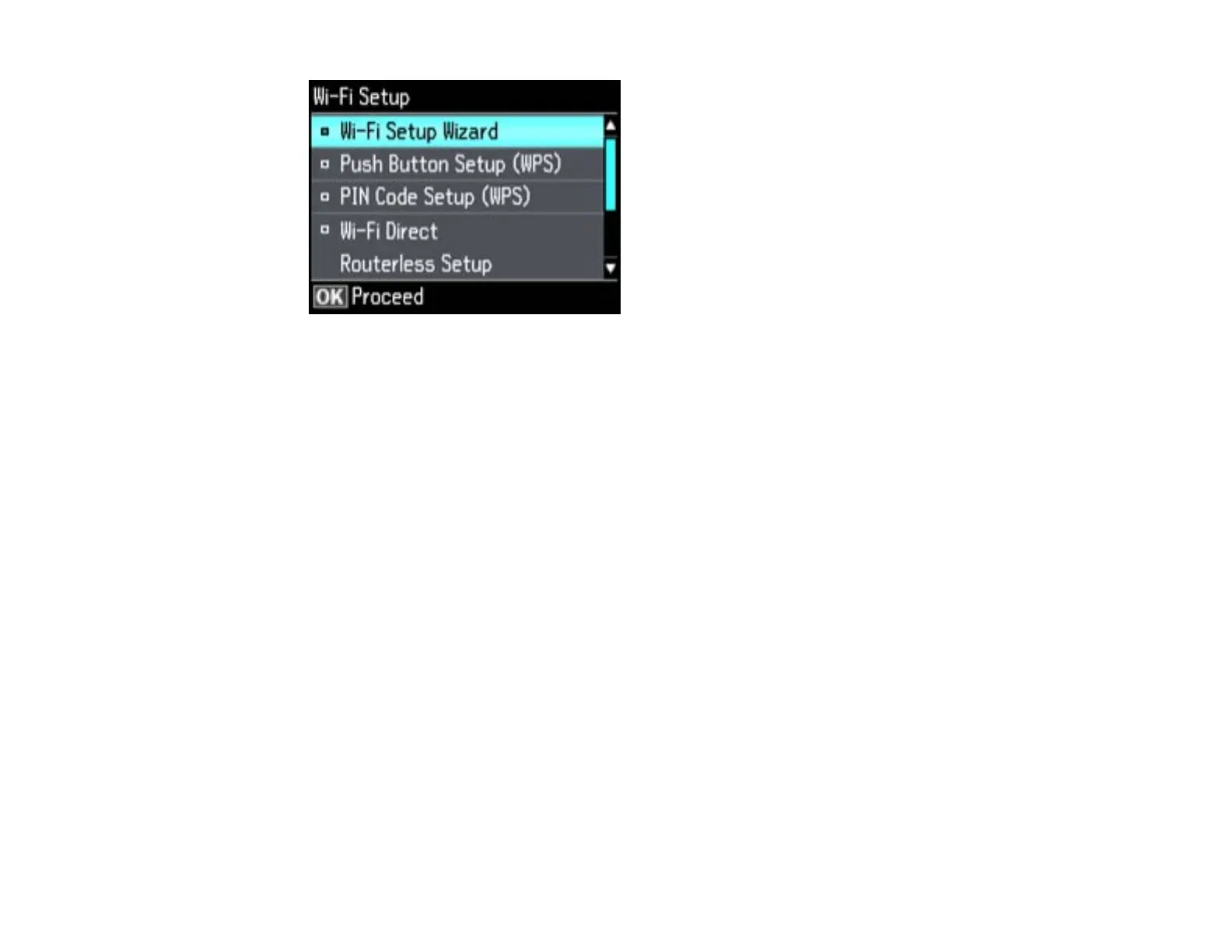 3. Press the arrow buttons to select Wi-Fi Direct Routerless Setup and press the OK button.