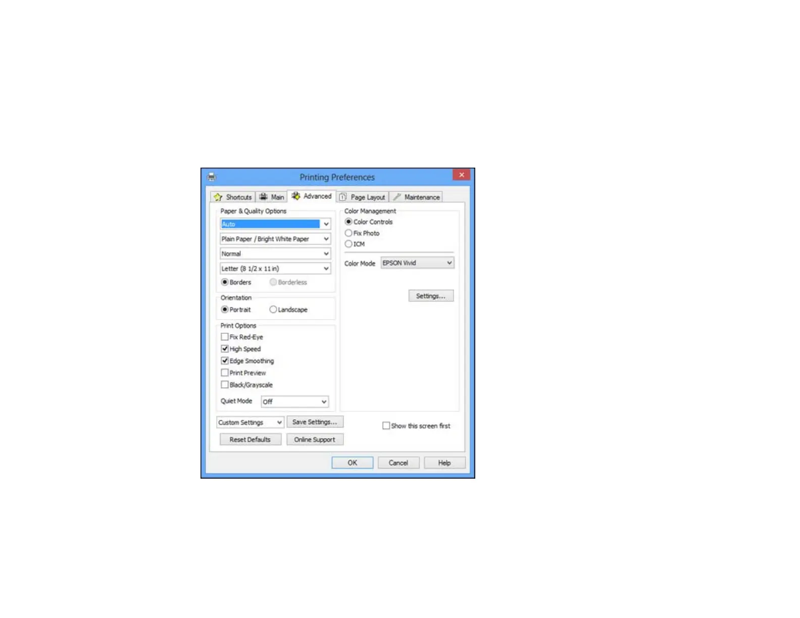 Select print settings on the Advanced tab to customize the quality and color settings for your printout,