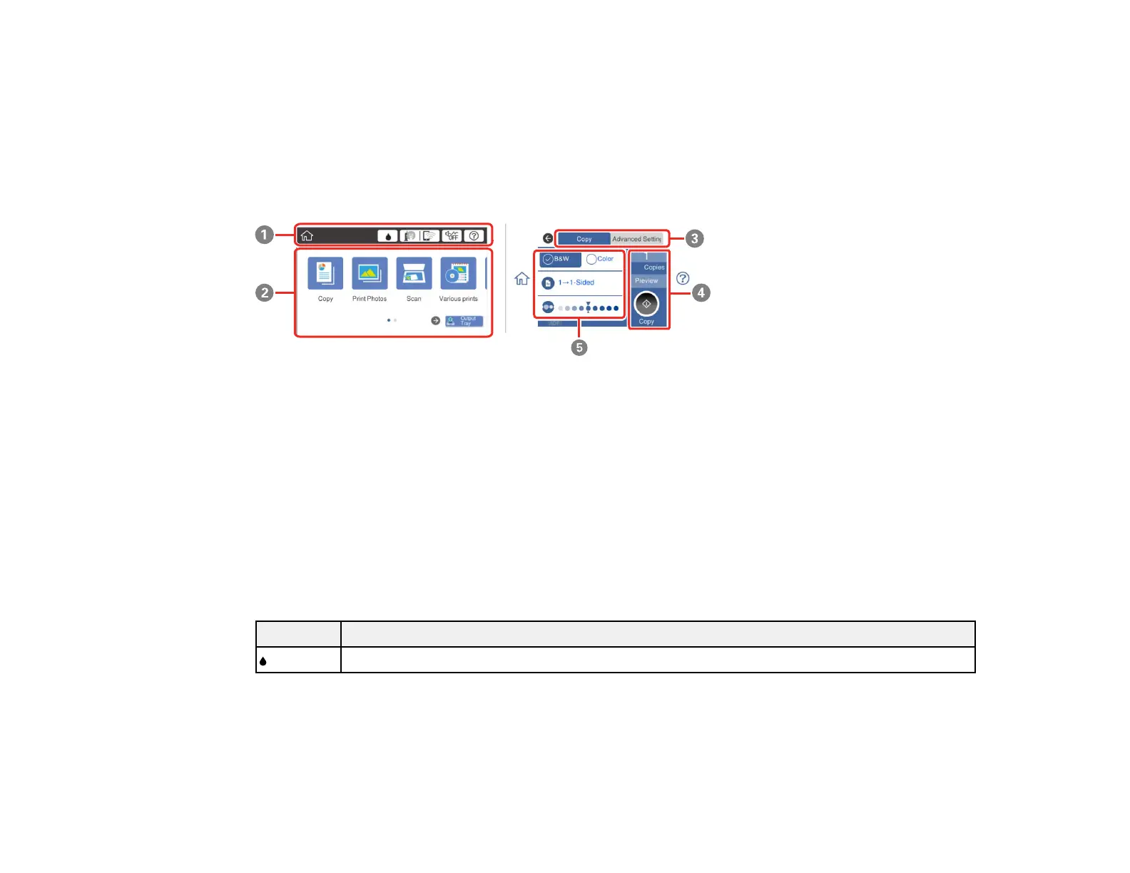 1 Displays various status information; select an icon to check its status or adjust its settings