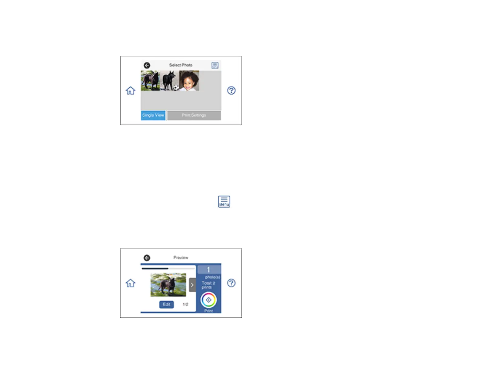 • Select Single View, select the thumbnail of the photo you want to print, then press the left or right