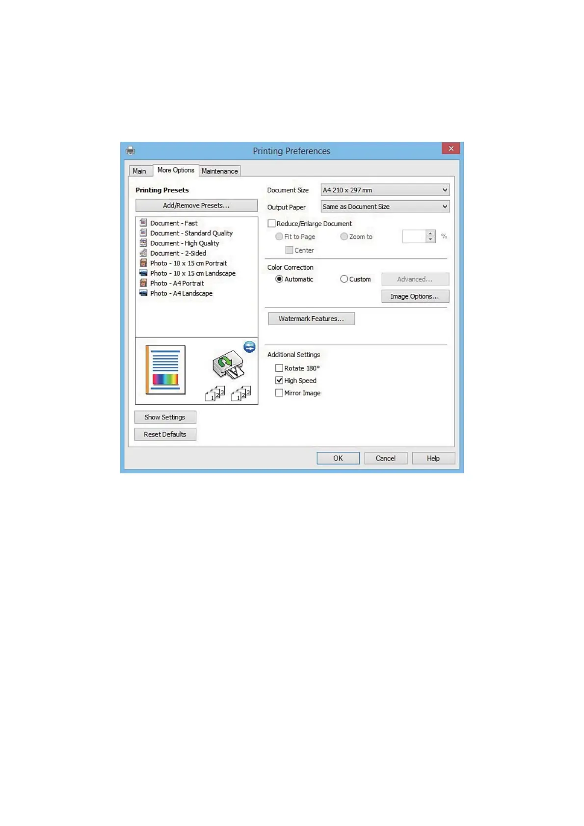 You can select additional layout and printing options such as changing the size of a printout or making color
