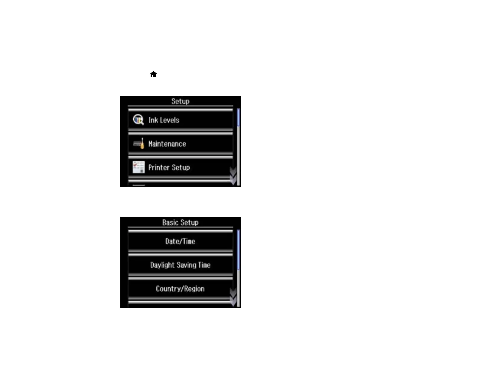 2. Press the left or right arrow button and then select Setup.