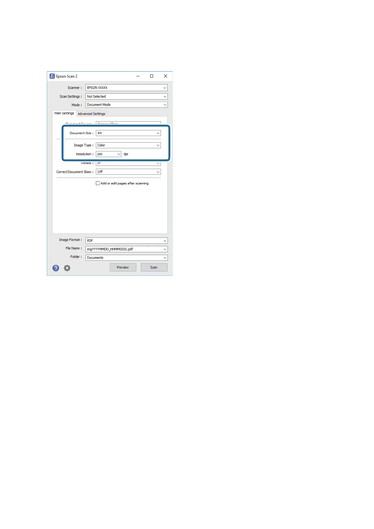 addition, if you set the Image Format as PDF or Multi-TIFF, you can save the scanned images as one le.