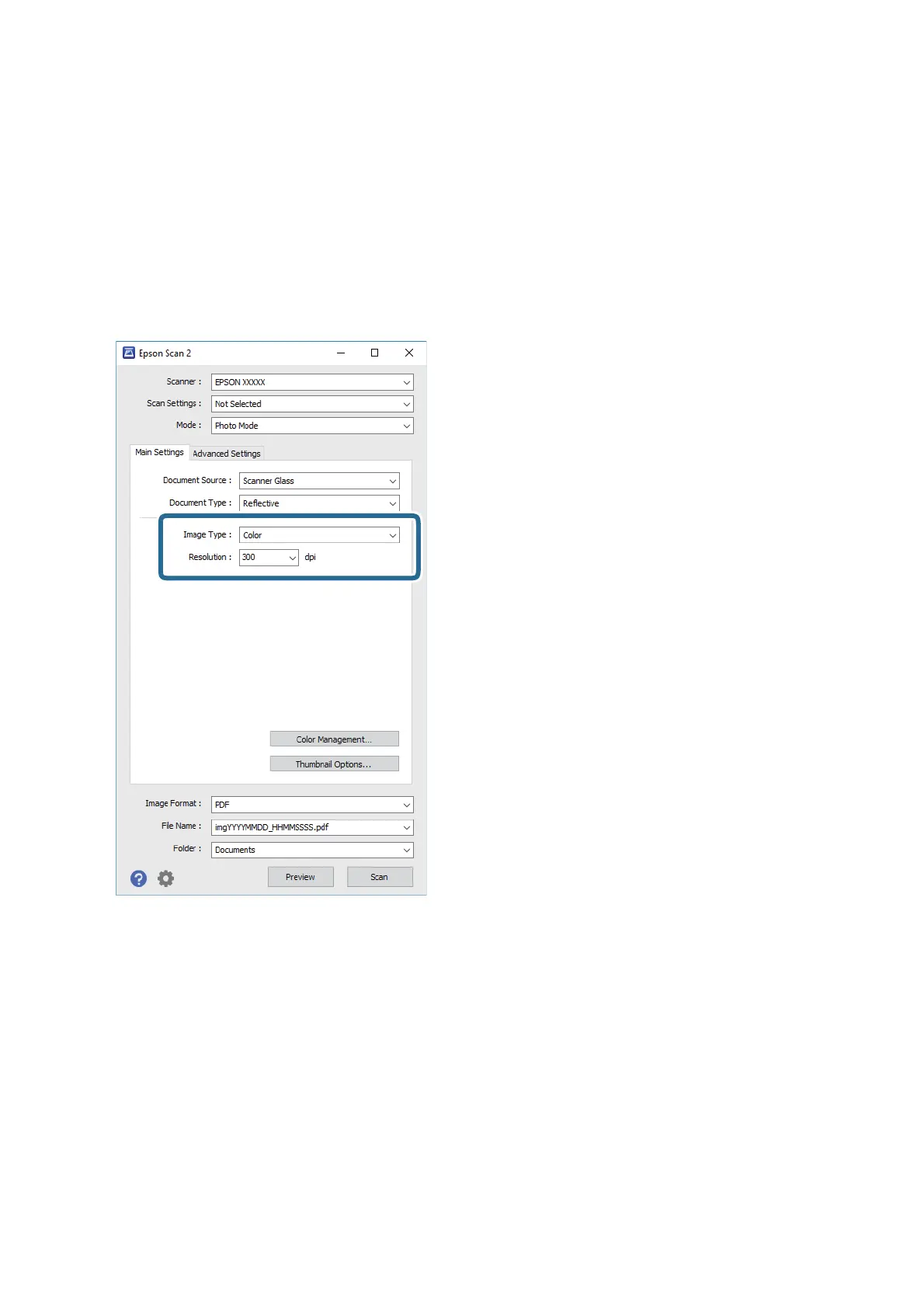 ❏ Image Type: Select the color for saving the scanned image.