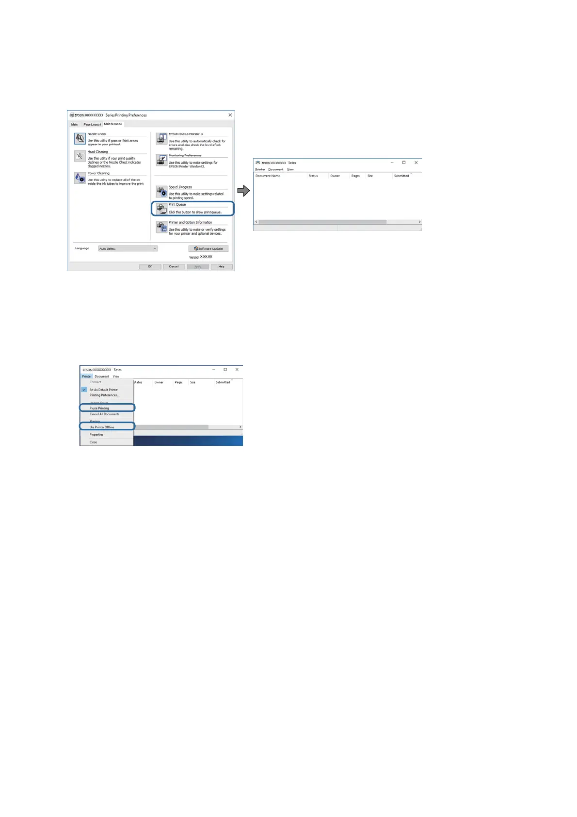 ❏ Click Print Queue on the printer driver's Maintenance tab, and then check the following.