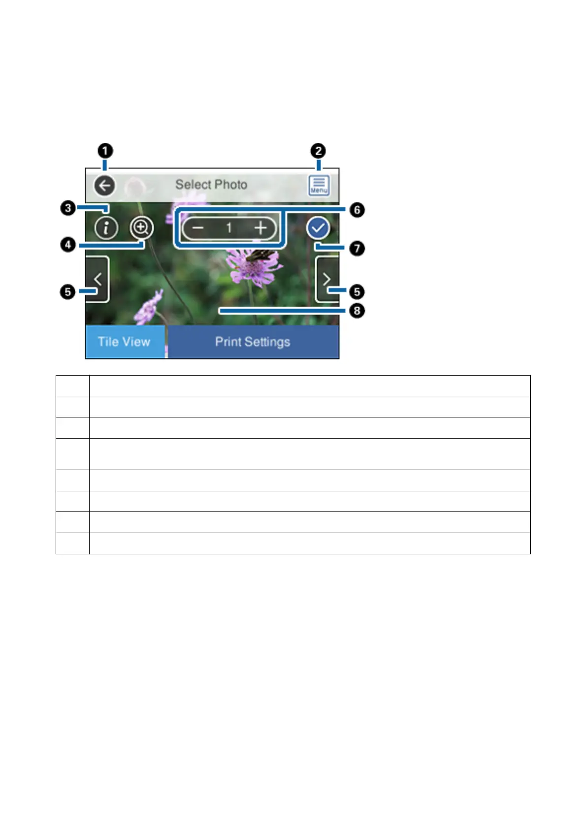 Tap Single View on the select photo screen to display this screen. Here you can view enlarged photos one by one.