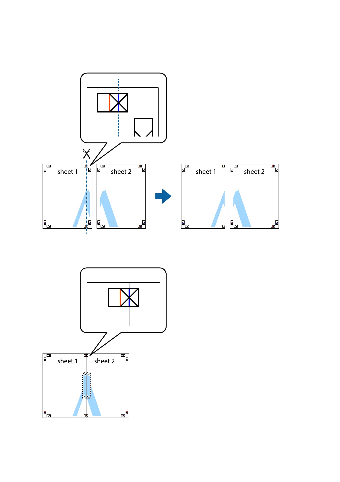 2. Place the edge of Sheet 1 on top of Sheet 2 and align the cross marks, then temporarily tape the two sheets