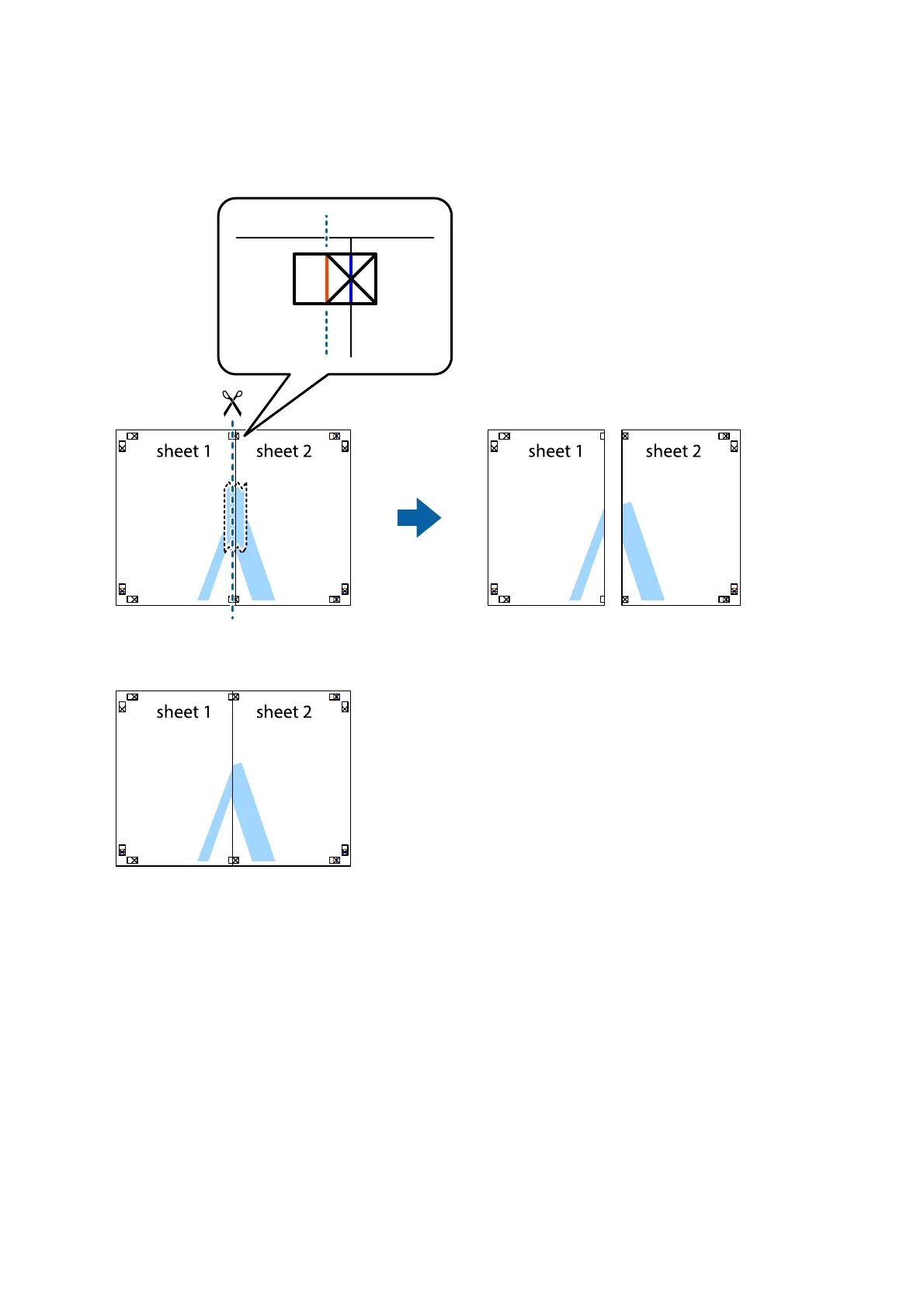 3. Cut the taped sheets in two along the vertical red line through the alignment markers (this time, the line to the