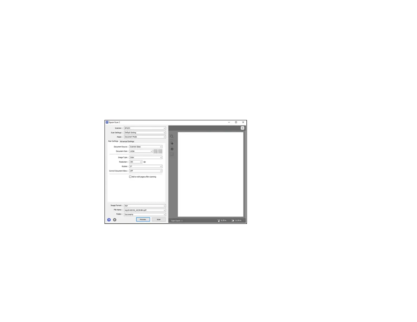 Epson Scan 2 previews your original and displays the results in the Epson Scan 2 window.
