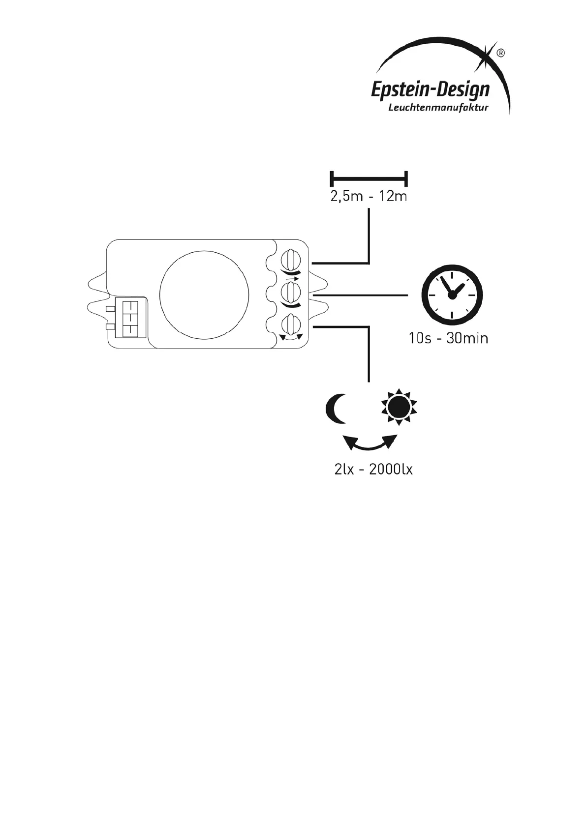 DE: Einstellbar von 2,5 - 12m, 10sec - 30min, 2lx - 2000lx; Funktionswinkel: 360°.