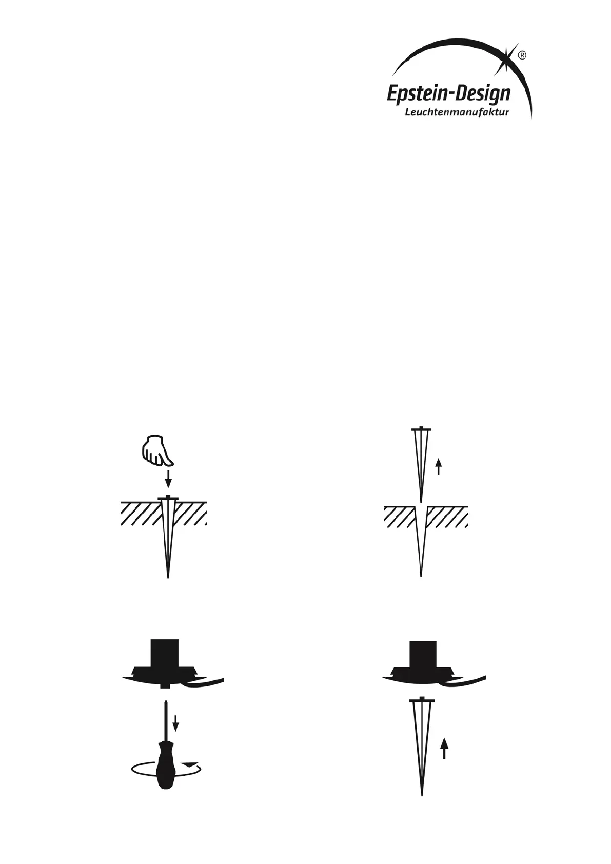 DE: 1. Spieß zunächst ohne Leuchte in die Erde stecken (1) und wieder heraus ziehen (2).