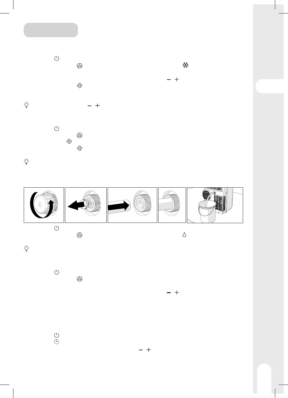 Neste modo, o tubo de drenagem contínua deve estar ligado para evacuar a água num recipiente ou para a rede de