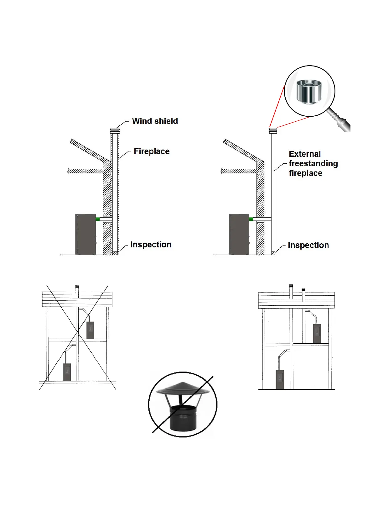 The end part of the evacuation system must have a minimum distance of 30cm from the exterior wall, in order to ensure a