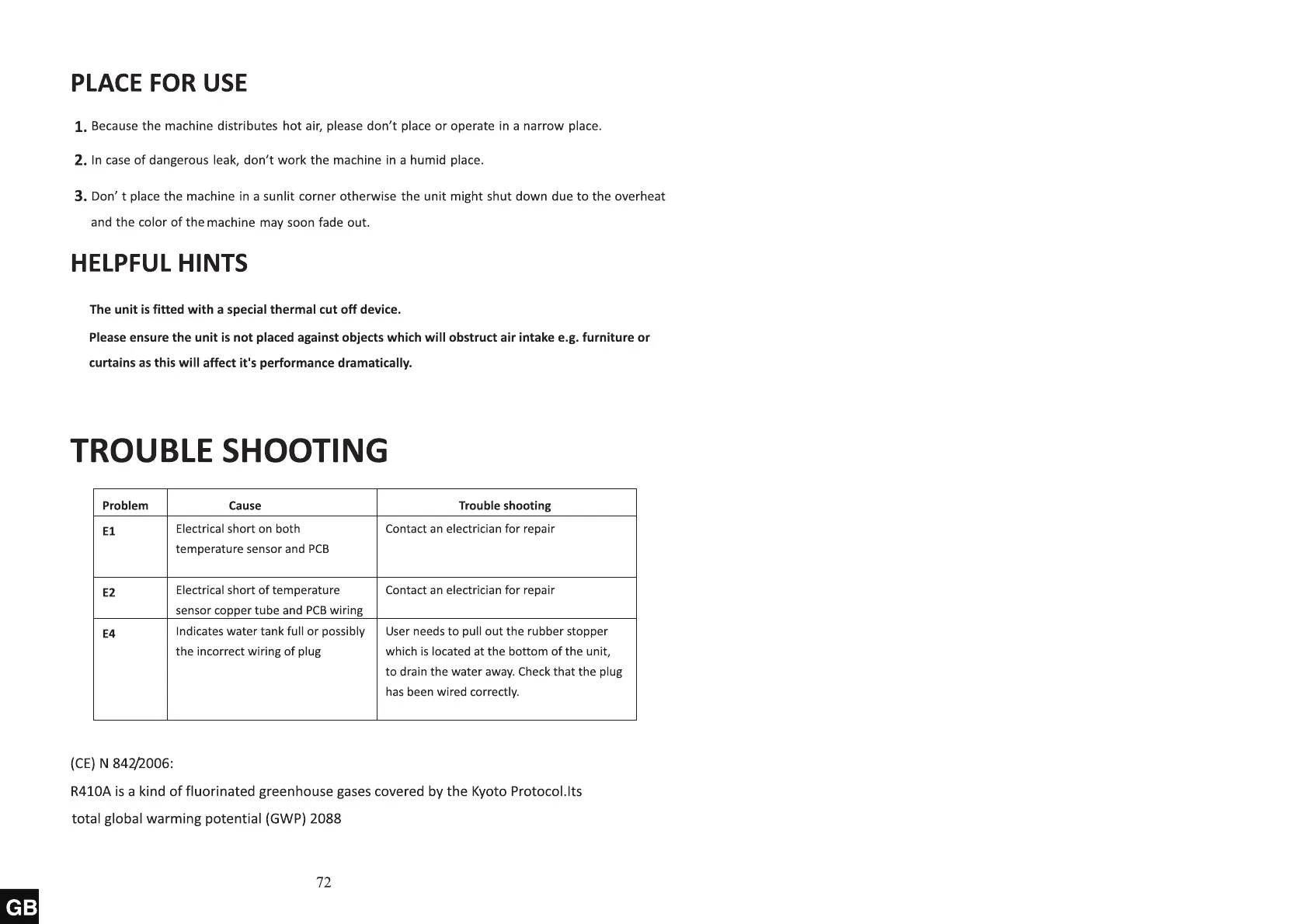 EQUATION PC26-AMF - Troubleshooting; Place for Use and Helpful Hints; Error Code Explanations