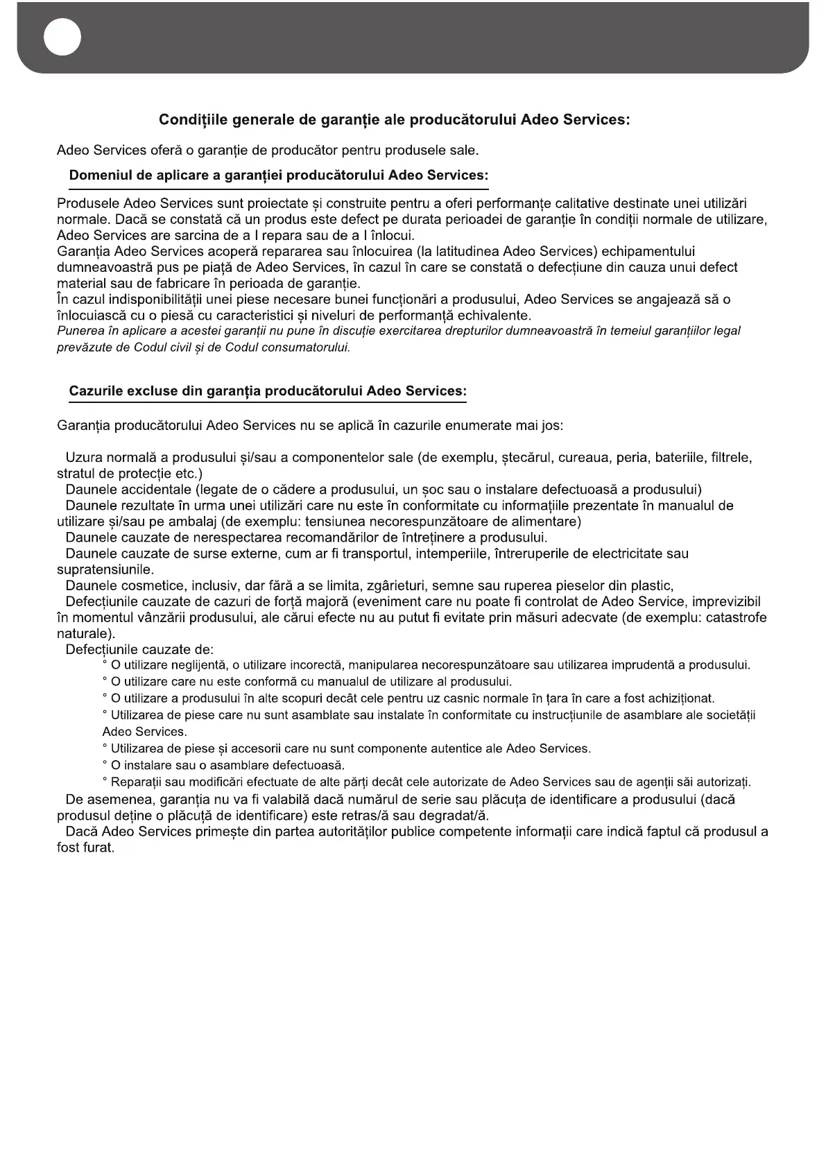 Condițiile generale de garanție ale producătorului Adeo Services