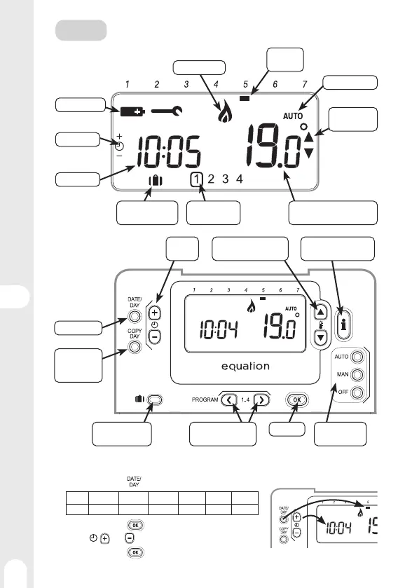 EQUATION TH30DP4 - USE; Thermostat Displays Overview; Thermostat Controls; Setting Time and Day