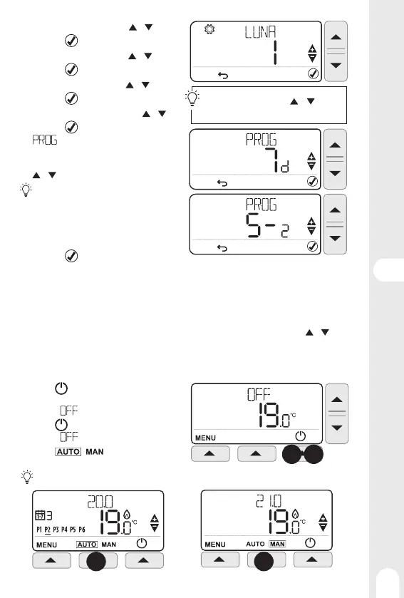 • AUTO: Termostatul urmează programele interne preînregistrate pentru fi ecare zi a săptămânii. Aceste pro-