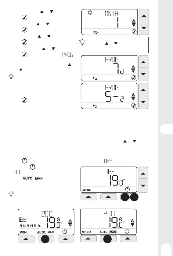 • AUTO : The thermostat follows the pre-recorded internal programs for each day of the week. These