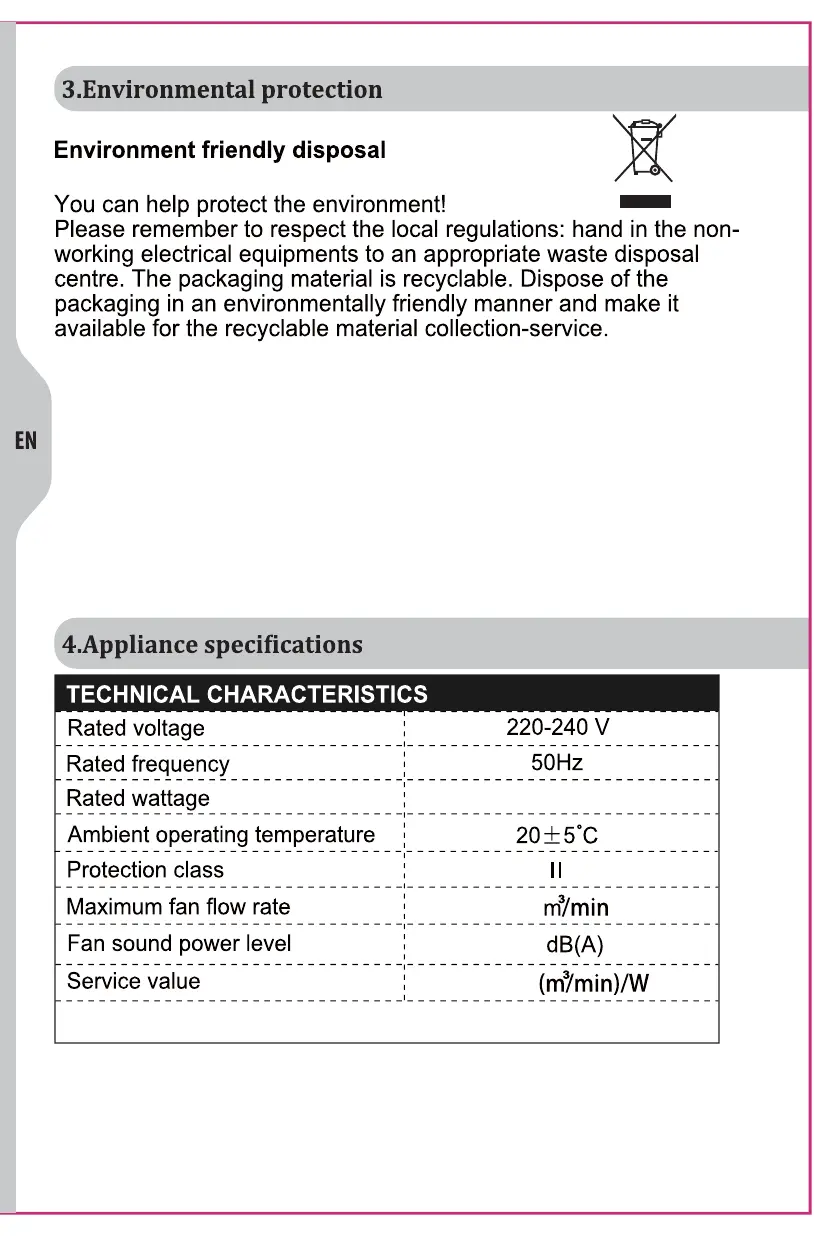 EQUATION TX-1601MF - Environmental Protection; Environment Friendly Disposal; Appliance Specifications; Technical Characteristics