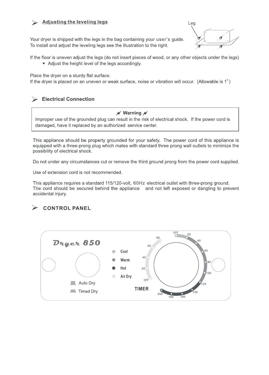 Equator 850 - Dryer Setup and Operation; Adjusting Leveling Legs; Electrical Connection; Control Panel Overview