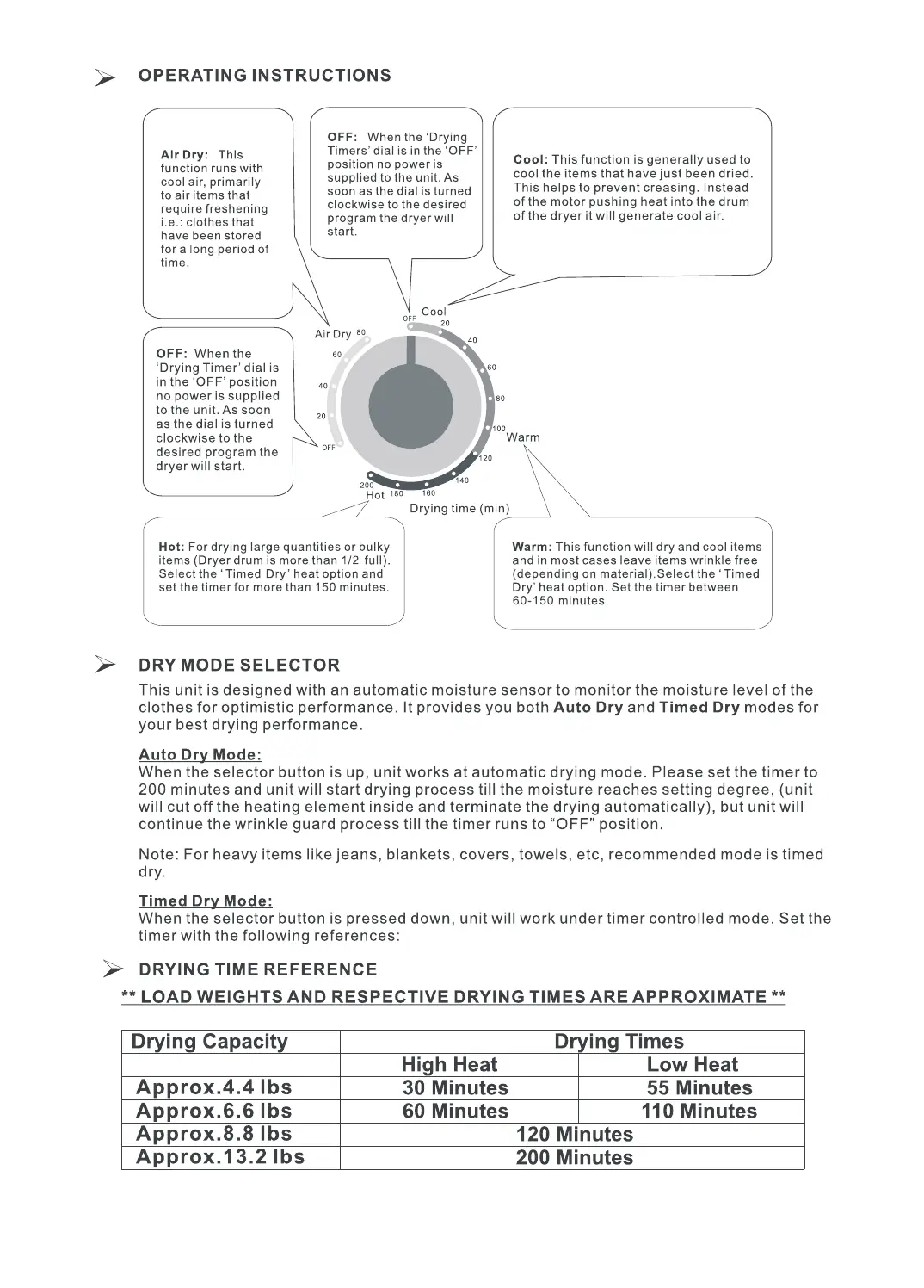 Equator 850 - Operating Instructions and Modes; Dryer Operating Modes Explained; Dry Mode Selector: Auto vs. Timed; Drying Time Reference