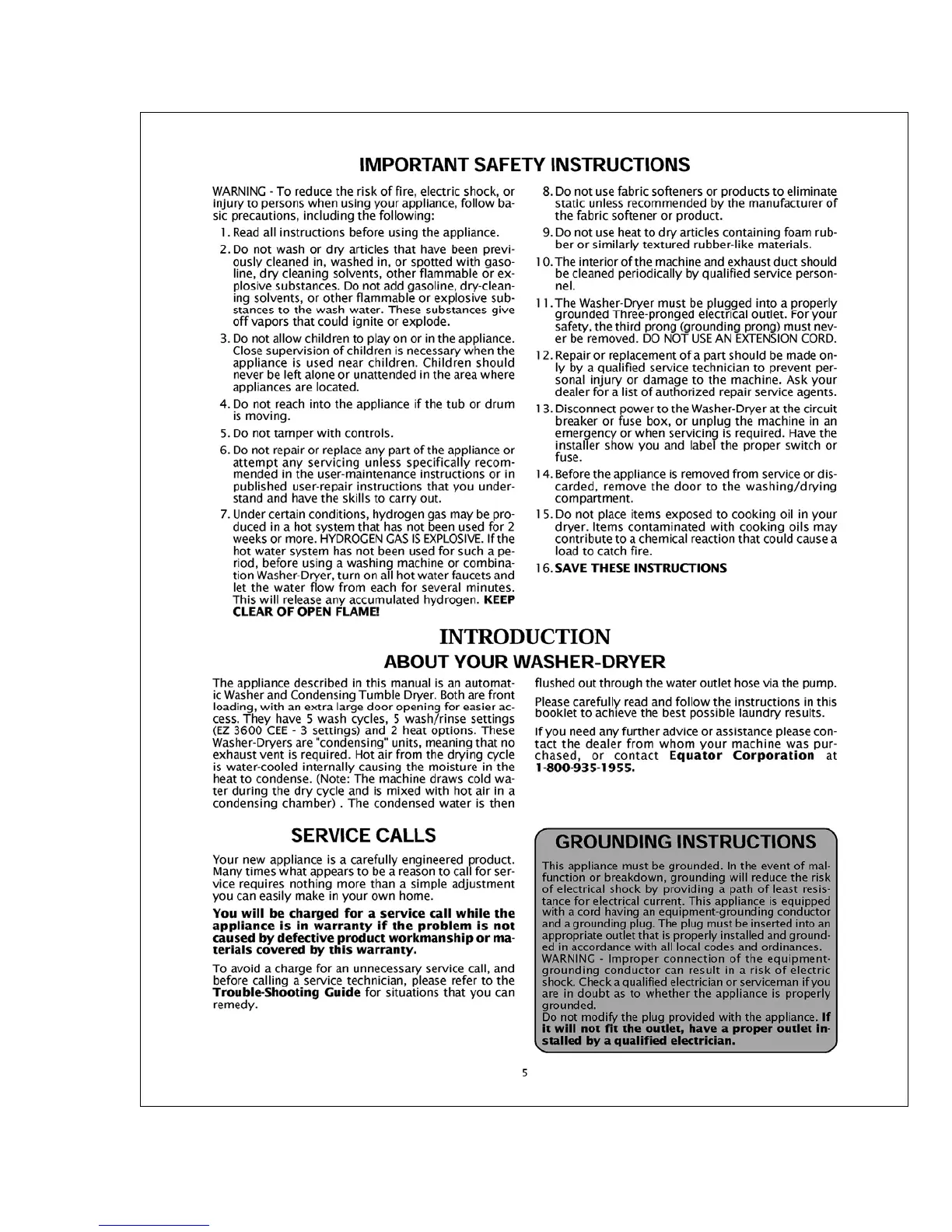 Equator CLOTHES-PROCESSOR EZ 3600 CEE - Important Safety Instructions; General Safety Precautions; Electrical and Hydrogen Gas Safety; Fire Hazard from Contaminated Items