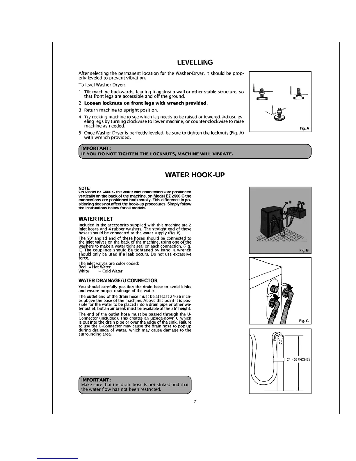 Equator CLOTHES-PROCESSOR EZ 3600 CEE - Leveling and Water Hook-Up Procedures; Leveling the Machine; Water Inlet and Drainage Setup