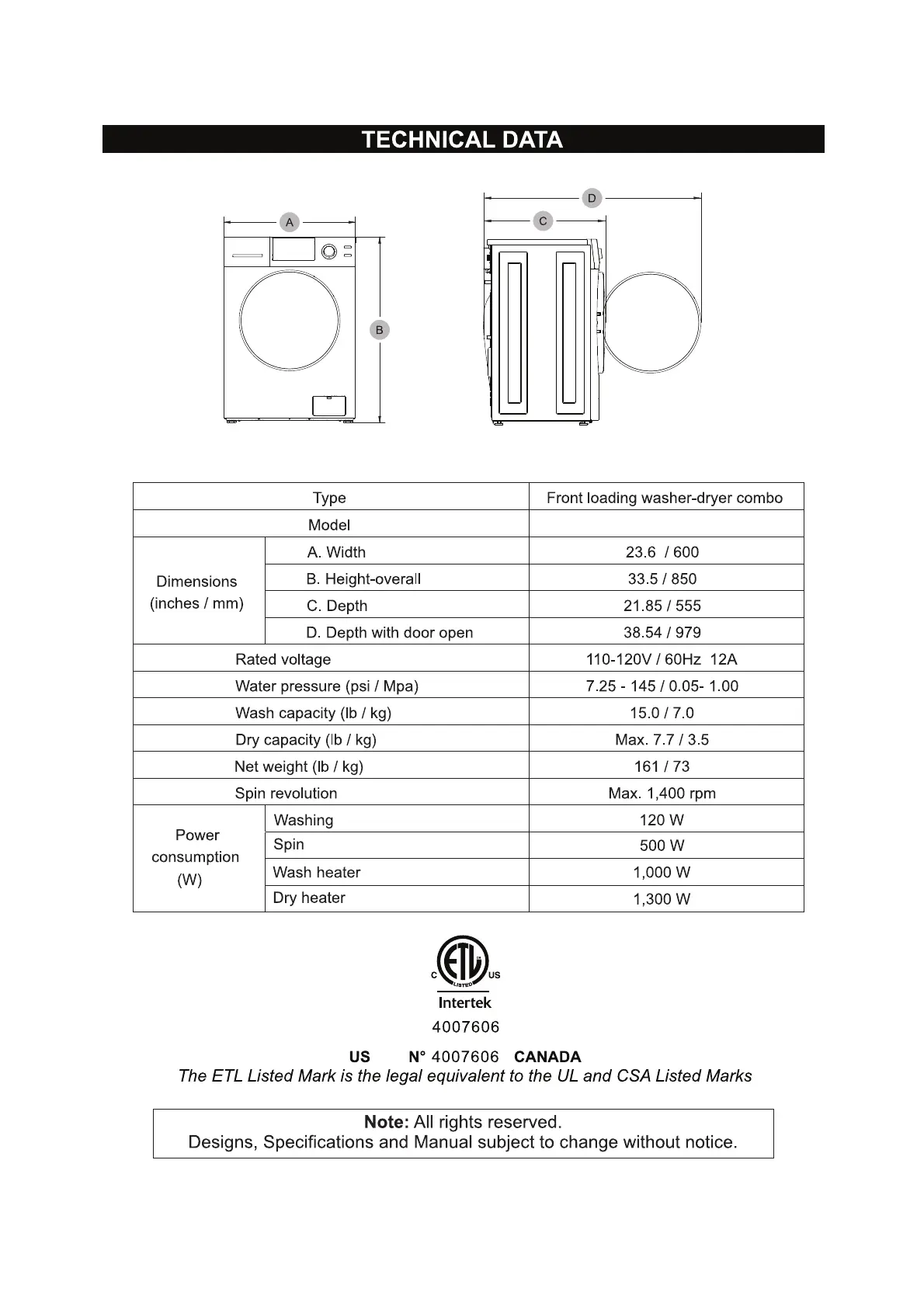 Equator EZ 4700 C - Technical Data; Dimensions; Rated Voltage and Pressure; Capacity and Weight