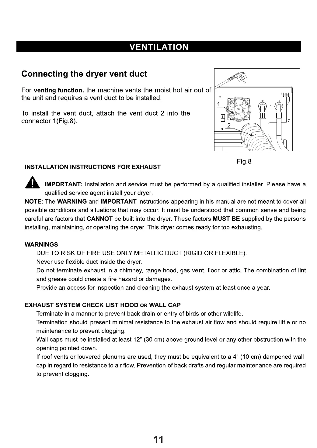Equator Super Combo 4400 - Ventilation; Connecting the Dryer Vent Duct; Installation Instructions for Exhaust; Warnings