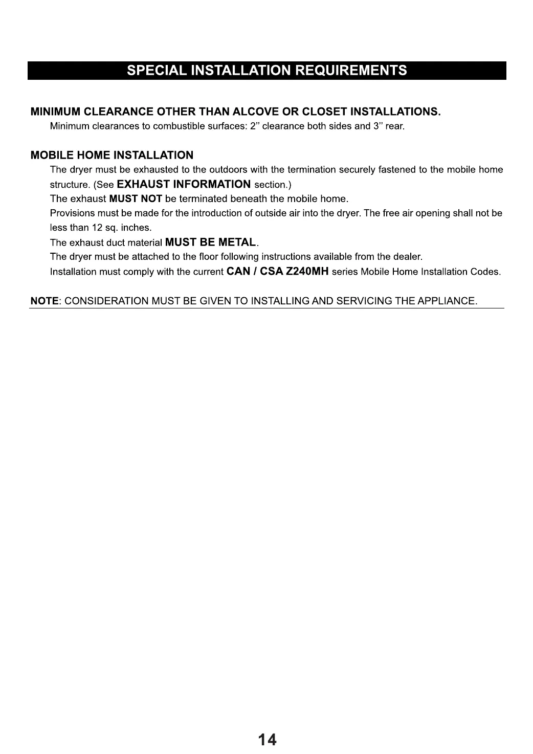 Equator Super Combo 4400 - Special Installation Requirements; Minimum Clearance Other Than Alcove or Closet Installations; Mobile Home Installation