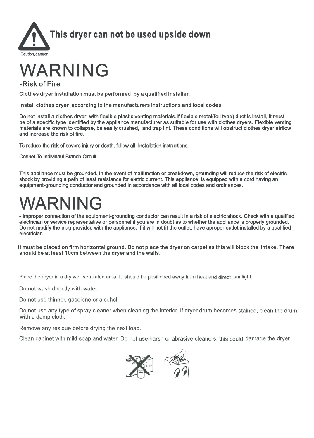 Equator Super Washer - Dryer Safety Warnings; Improper Installation Risks; Electrical Grounding Warning; Placement and Cleaning Precautions