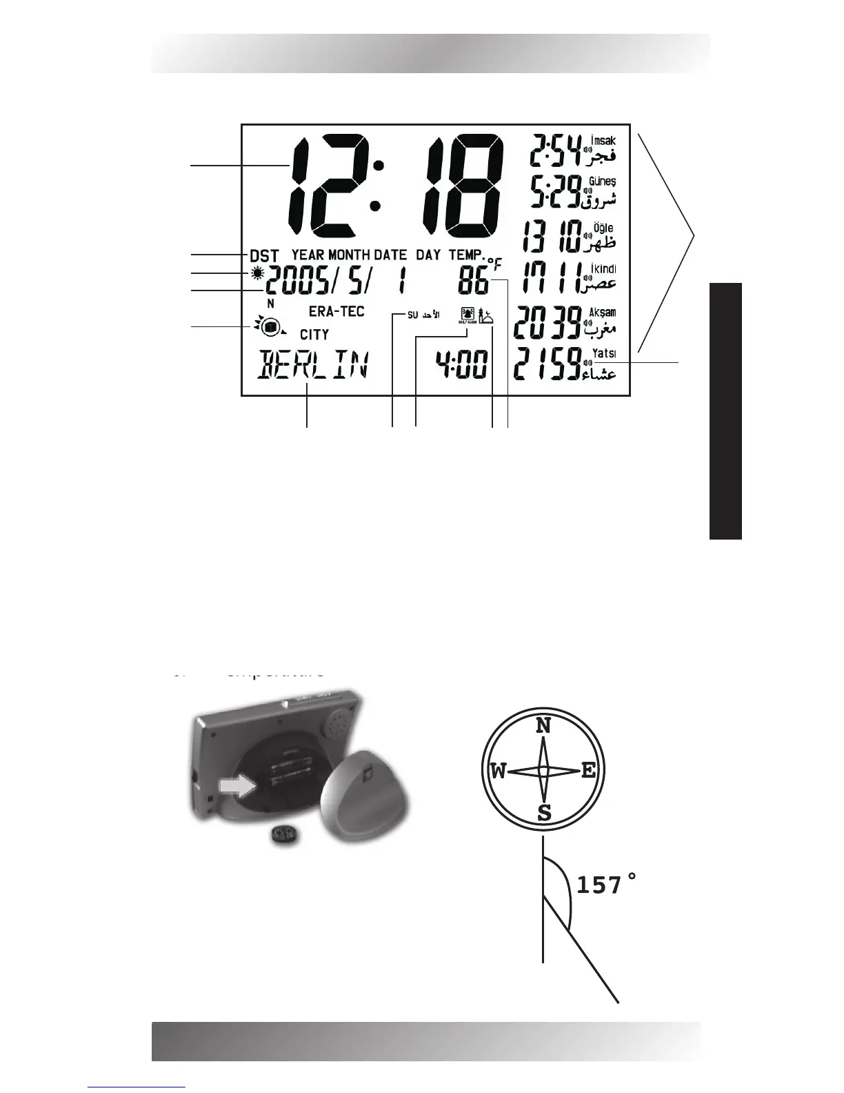 Eratec AZ-450 - Display Description and Features; Gregorian and Hijri Calendar; Kibla Direction Indicator; City Display