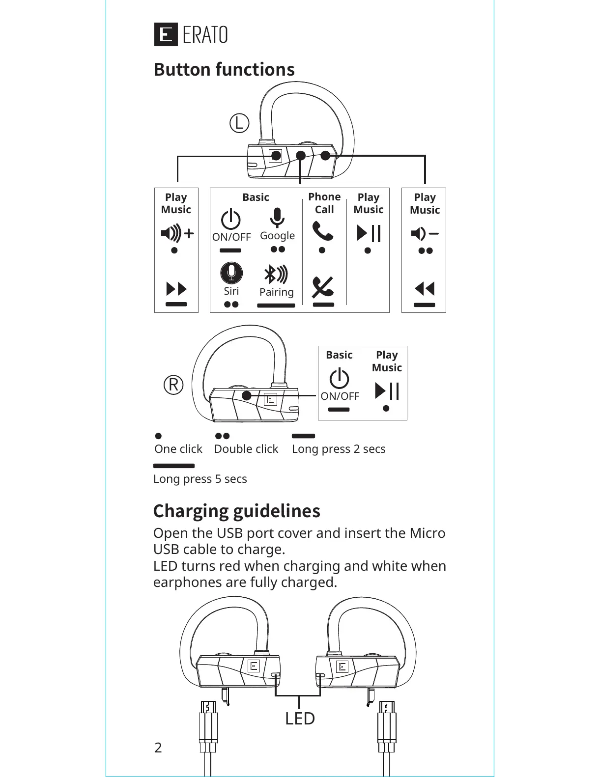 Erato RIO 3 - Earphone Controls and Functions; Button Functions for Music and Calls