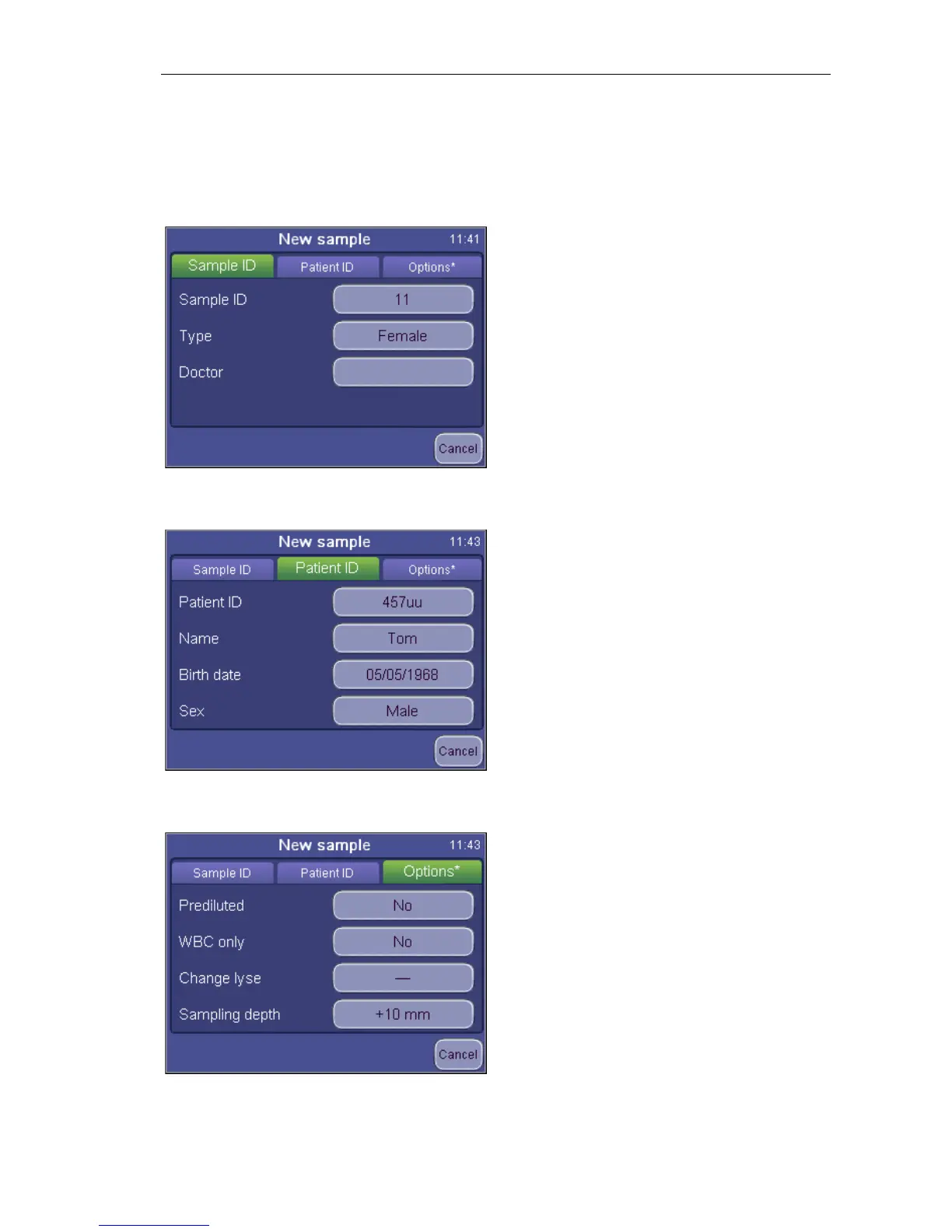 To enter sample information prior to sample analysis, touch sample info field in the