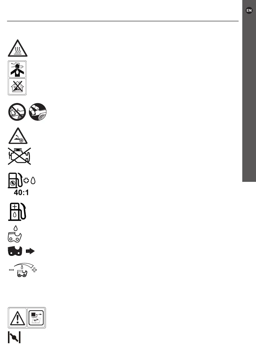 Only refuel unleaded petrol and oil mixture in ratio 40:1. Do not use any