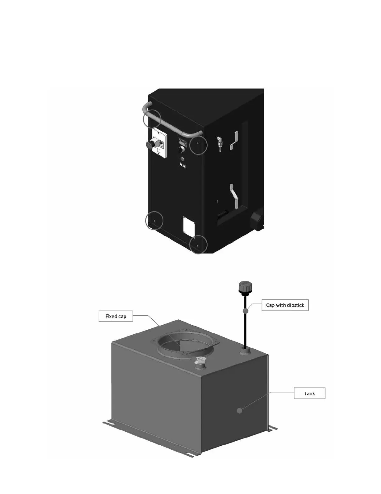 The machine is supplied with oil inside tank. This reservoir tank is located inside cabinet. Before first use