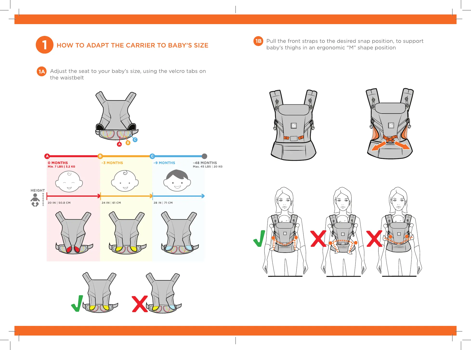 ergobaby ADAPT - How to Adapt the Carrier to Babys Size; Adjust Seat to Babys Size; Position Straps for Ergonomic M Shape