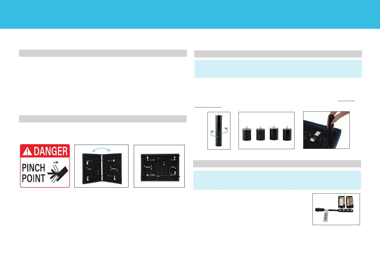 To install the legs, thread the leg into frame, and tighten by hand. Do not
