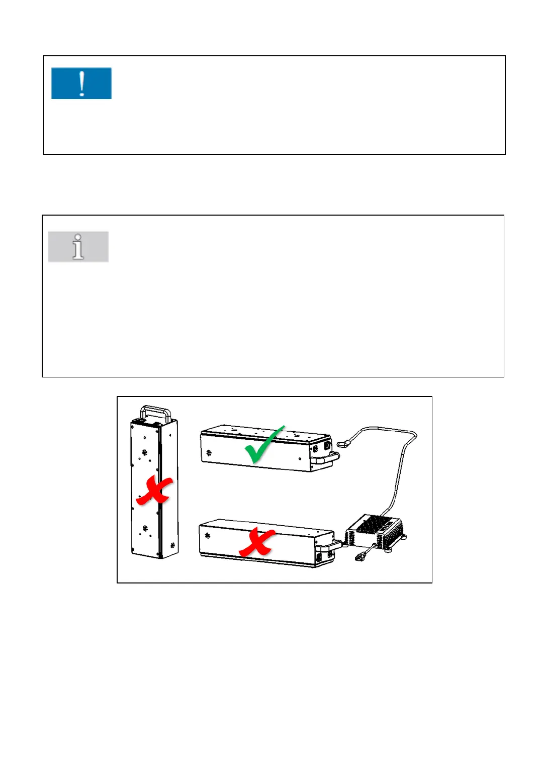 (cover always upside). Never place the battery pack in lateral or upright
