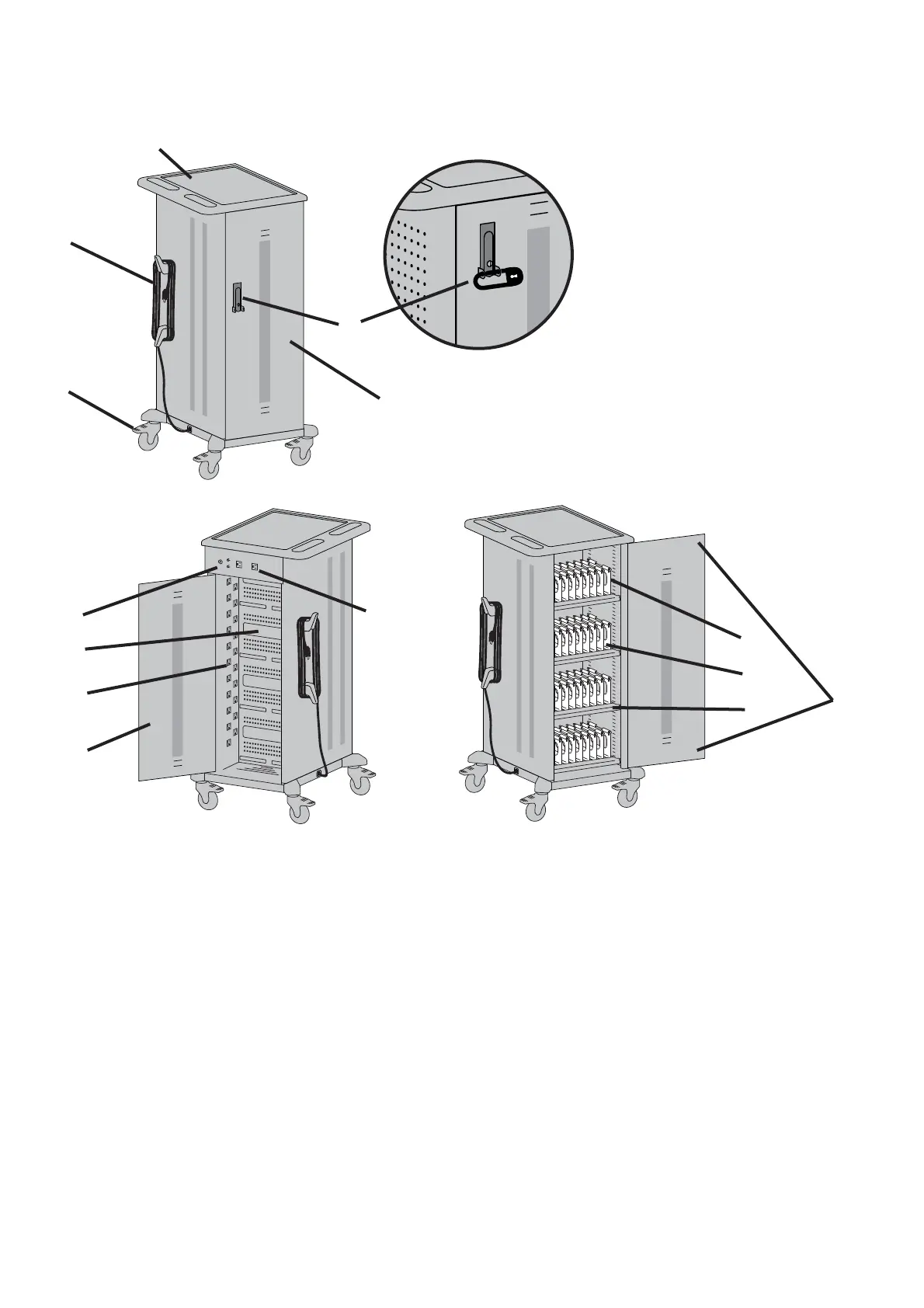 The doors on the cart feature a two-point keyed locking system to protect your devices. To open a door, lift the bottom of the handle and