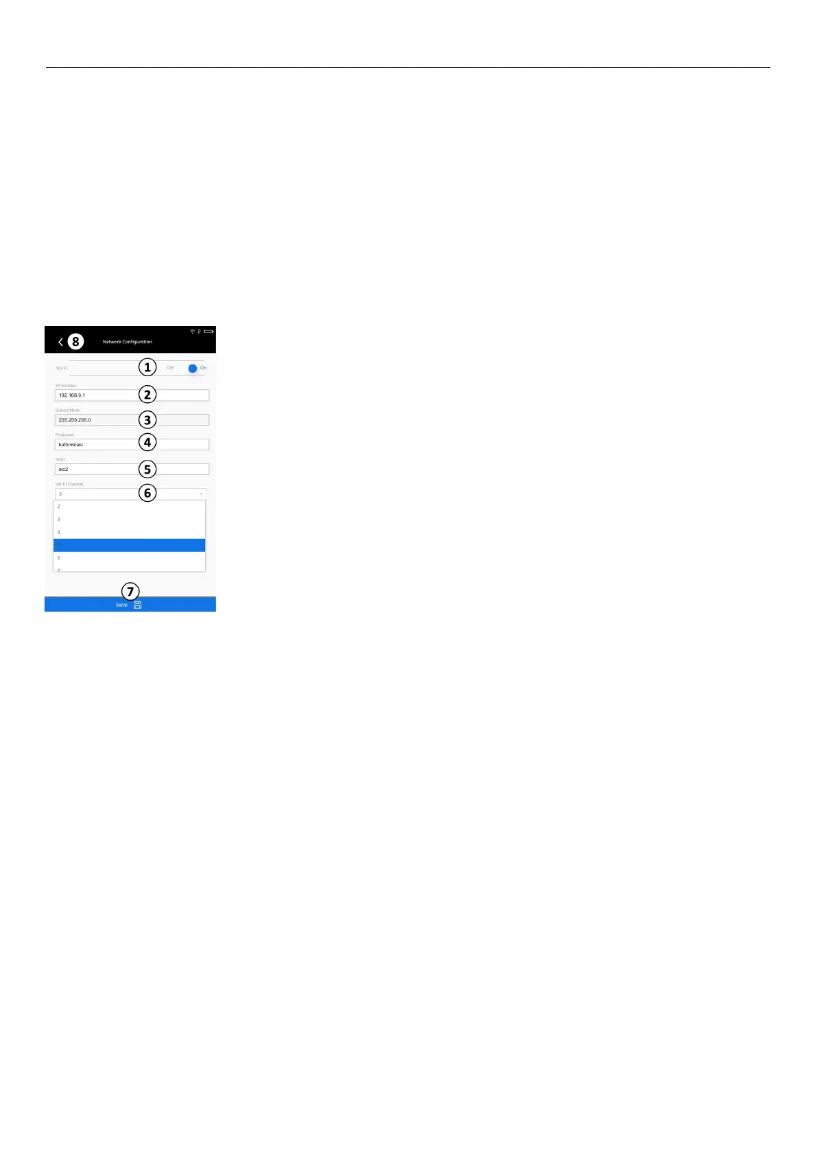 ⑥ Selects a Wi-Fi channel from the values 2 –11, see section