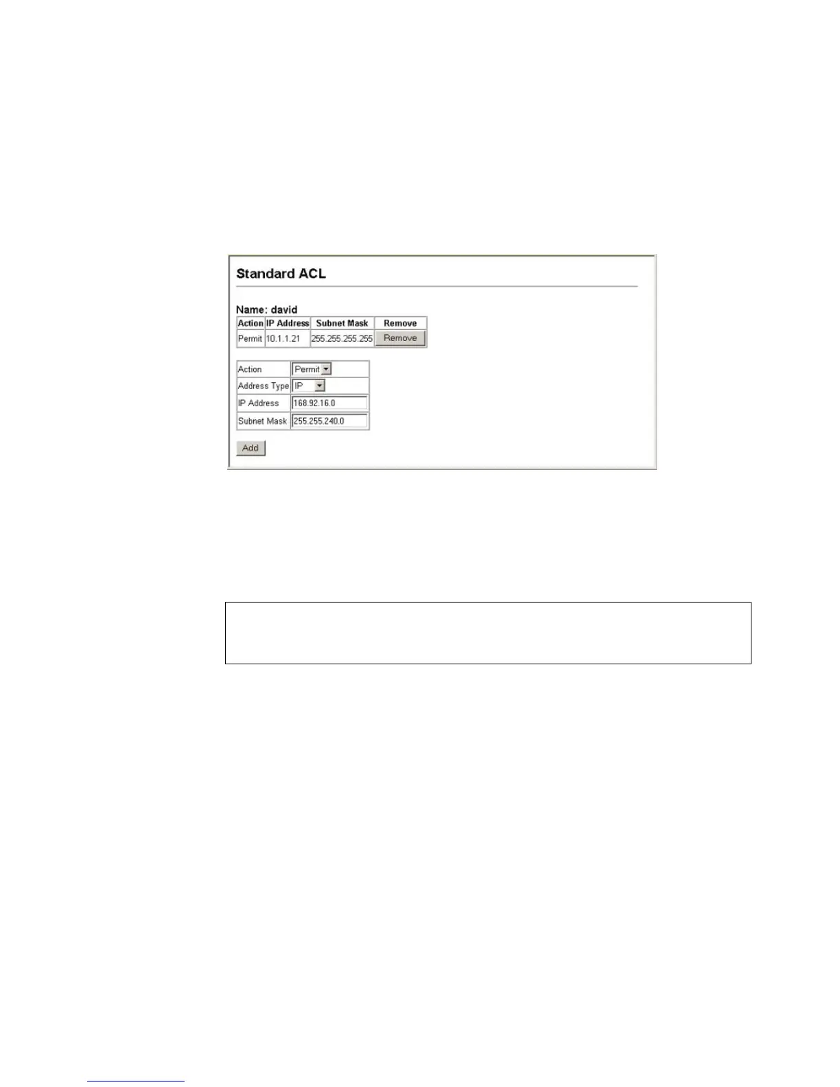Console(config-std-acl)#permit host 10.1.1.21